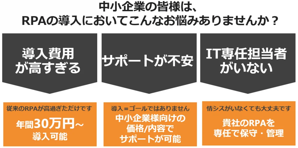 中小企業様の業務の自動化を支援している弊社では、RPA (Robotic Process Automation) を主軸に提案しています。オフィスでの定型業務を仮想知的ロボットが遂行するシステムがRPAですが、導入が進みにくい中小企業様に対し、導入コスト・サポート体制・保守管理を専任するといった「低コストかつ充実したサポート体制」を提供することで、導入実績を増やしています。