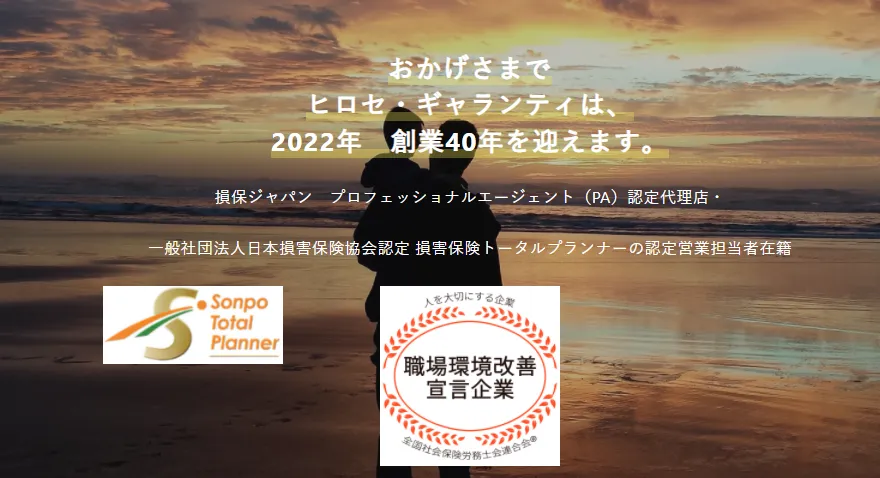 株式会社ヒロセ・ギャランティは、創業40年を迎える企業であり、損保ジャパン プロフェッショナルエージェント(PA)の認定代理店です。また、一般社団法人日本損害保険協会認定 損害保険トータルプランナーの認定営業担当者も在籍しているなど、「お客様の立場に立った保険」をモットーに、お客様との信頼関係を大切にしています。安心して、保険のご相談をしていただければ幸いです。
